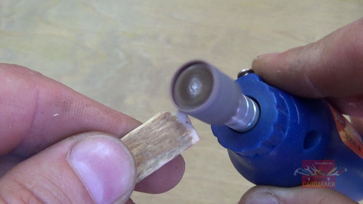 Но если таких кругов не осталось, то можно взять обычную наждачку, только желательно на тряпочной основе, отрезать от нее полоску и при помощи деревянного чепика зафиксировать на насадке. Как показала практика, такая насадка ничем не уступает заводской и для мелких работ подходит замечательно.