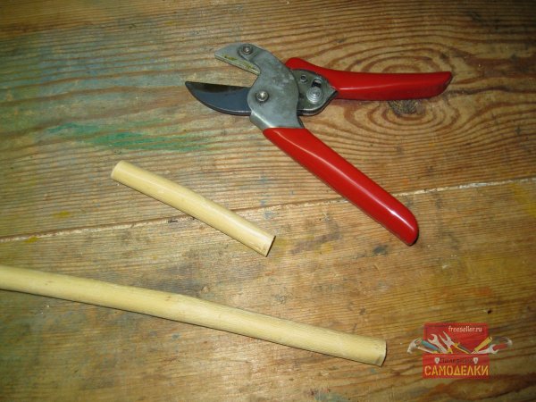 Сначала я отрезал от ветки при помощи секатора, вот такой кусок длиной 10-12 см. Он будет играть роль деревянной ручки, одетой на веревку, чтобы веревка не резала руку.