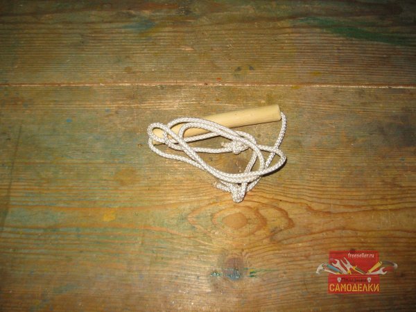 И продел сквозь нее веревку, используя при этом тонкую стальную проволоку. Один конец веревки, я зажал в петле проволоки и таким образом, протащил ее через отверстие деревянной ручки.