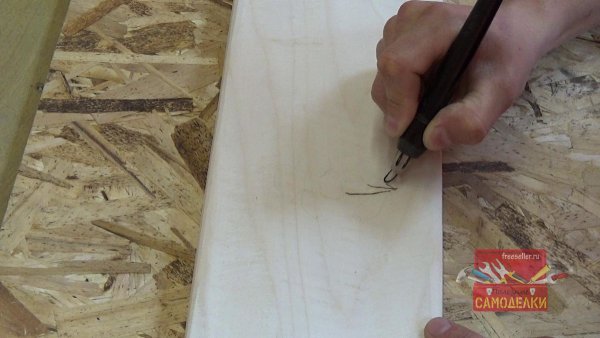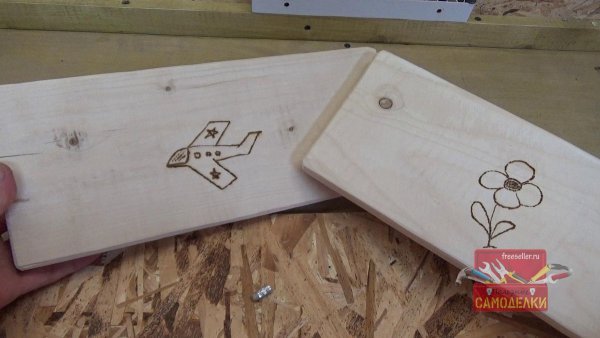 Так как у меня дочка и сын, поэтому нужно что бы качели были у каждого свои. Дочка попросила цветок, а сын самолетик. Поэтому при помощи выжигателя по дереву изобразил их на сидушках.