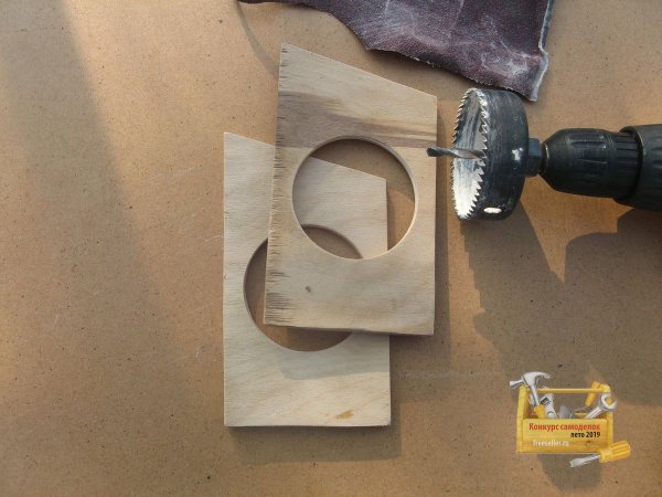 Две заготовки нужны для поддержки крыши. В них коронкой по дереву проделываю два отверстия. Так птичкам удобно сидеть. Все заготовки шлифую наждачной бумагой.