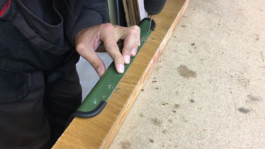 Далее обозначил место для петель и просверлил отверстия под заклепки. По цвету заклепки подбирались в тон канистры. Затем зафиксировал заклепки заклепочником.