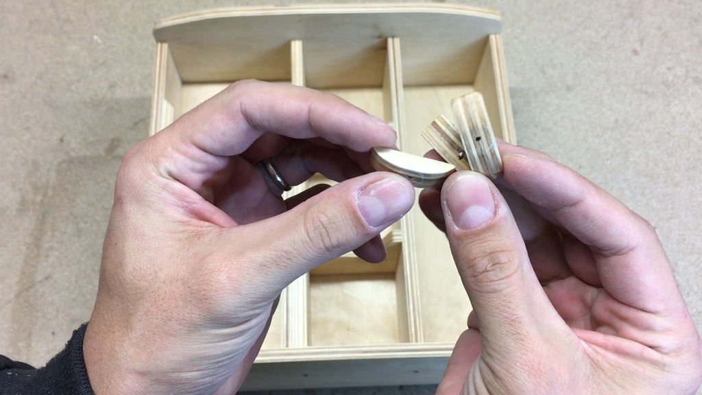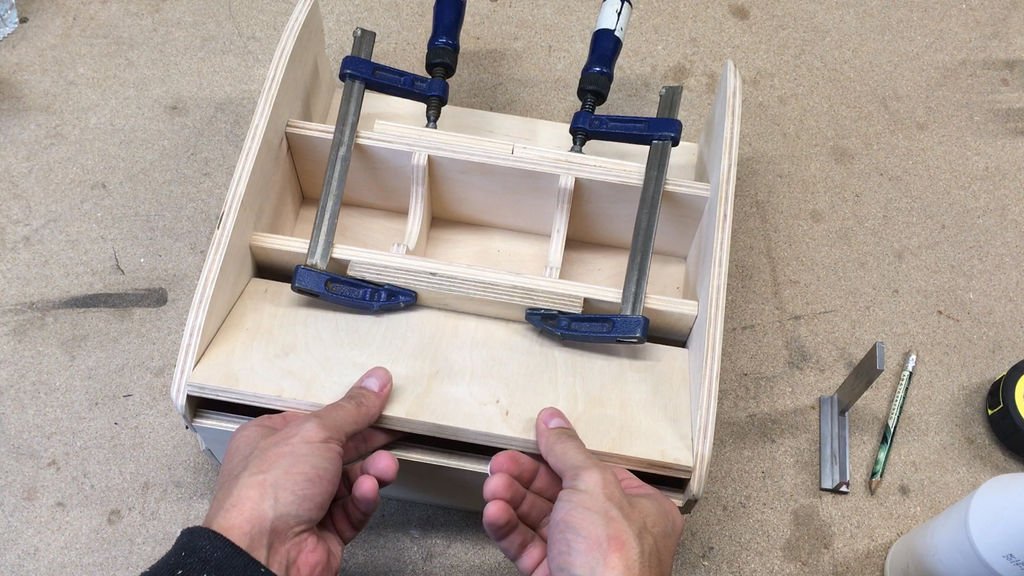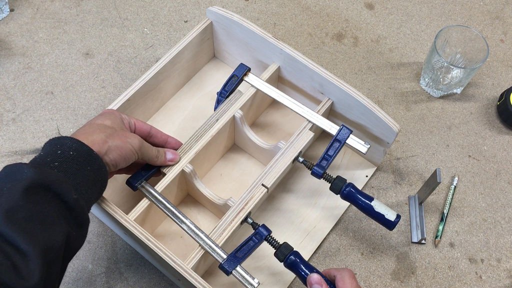 Сначала отодвигает одну сторону, чтобы получить больше места для установления зажимов. Чтобы банки с колой держались в ряд, были наклеены два боковых держателя. Для финишной отделки фанеры использовался прозрачный матовый лак.