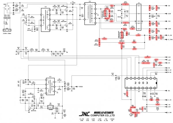 Распаиваем провода по измененной схеме. Зеленым маркером указаны точки, куда будут припаяны стабилизаторы. Два верхних стабилизатора припаиваем к выходу третьего. Выхода верхних стабилизаторов, и выход нижнего распаиваем на указанные точки: +3,3; +5; +12 вольт.