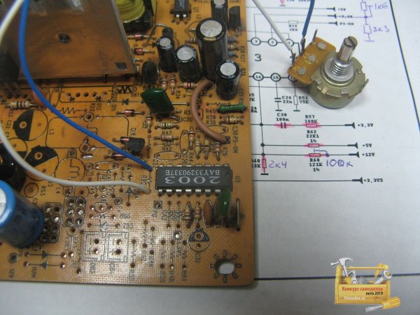 R60-й резистор временно заменил регулировочным. С помощью его, осуществляется регулировка выходного напряжения. Коричневая перемычка нужна для запуска БП, замыкает PC-ON на общий.