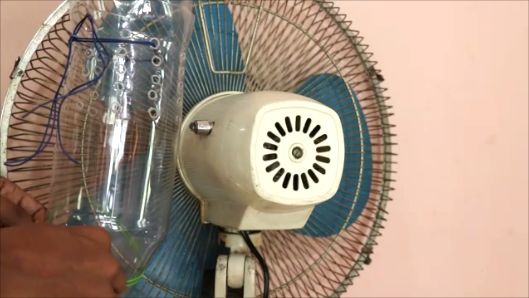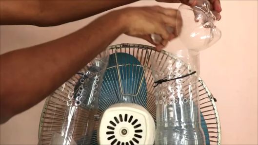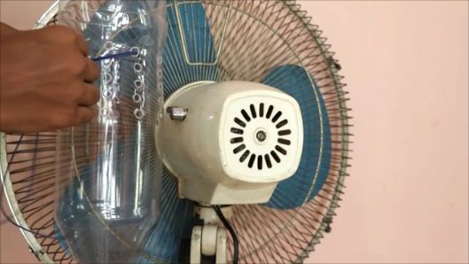 С помощью проволоки крепим подготовленные бутылки к корпусу вентилятора.