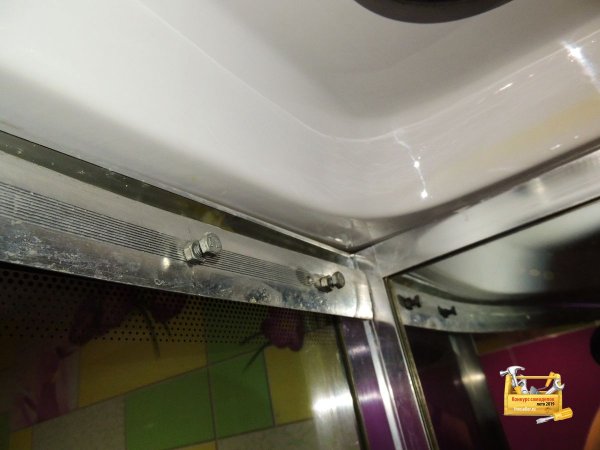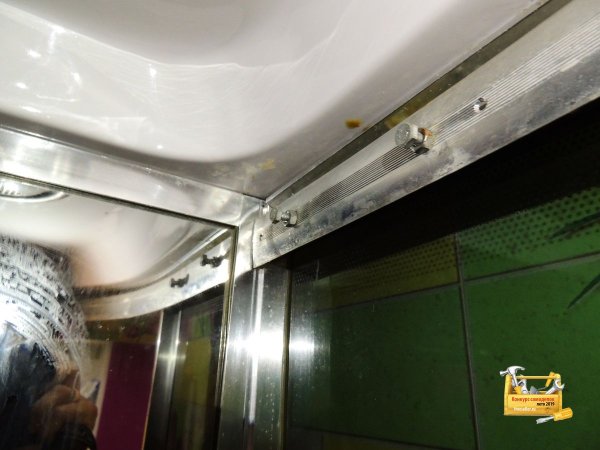 В качестве крепежа использовал болты 6 мм по две гайки на каждый. В общем принцип такой, с начала на болт накручивается гайка, после этого просовывается в отверстие порожка и с другой стороны зажимается второй гайкой, далее вкручивается в отверстие с резьбой профиля бокса, гайка играет роль ограничителя, и благодаря ей шторка сможет двигаться практически по всей длине. Фото сделано мною уже после долгого использования, но, тем не менее, думаю, будет понятно.