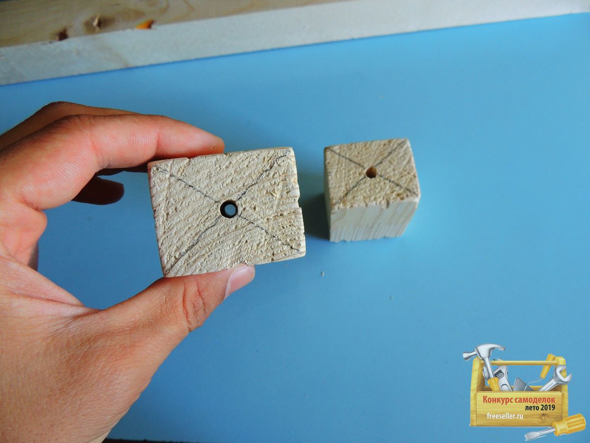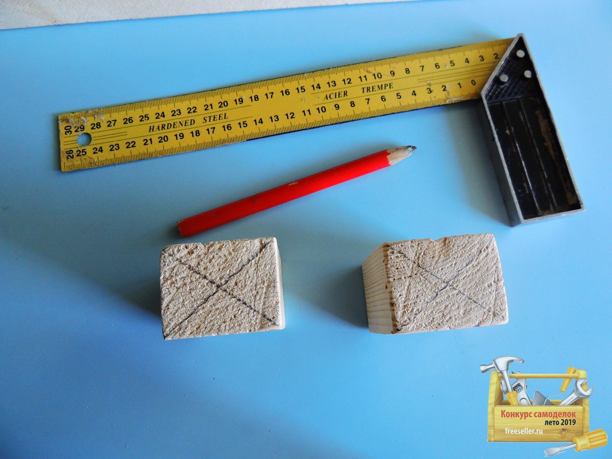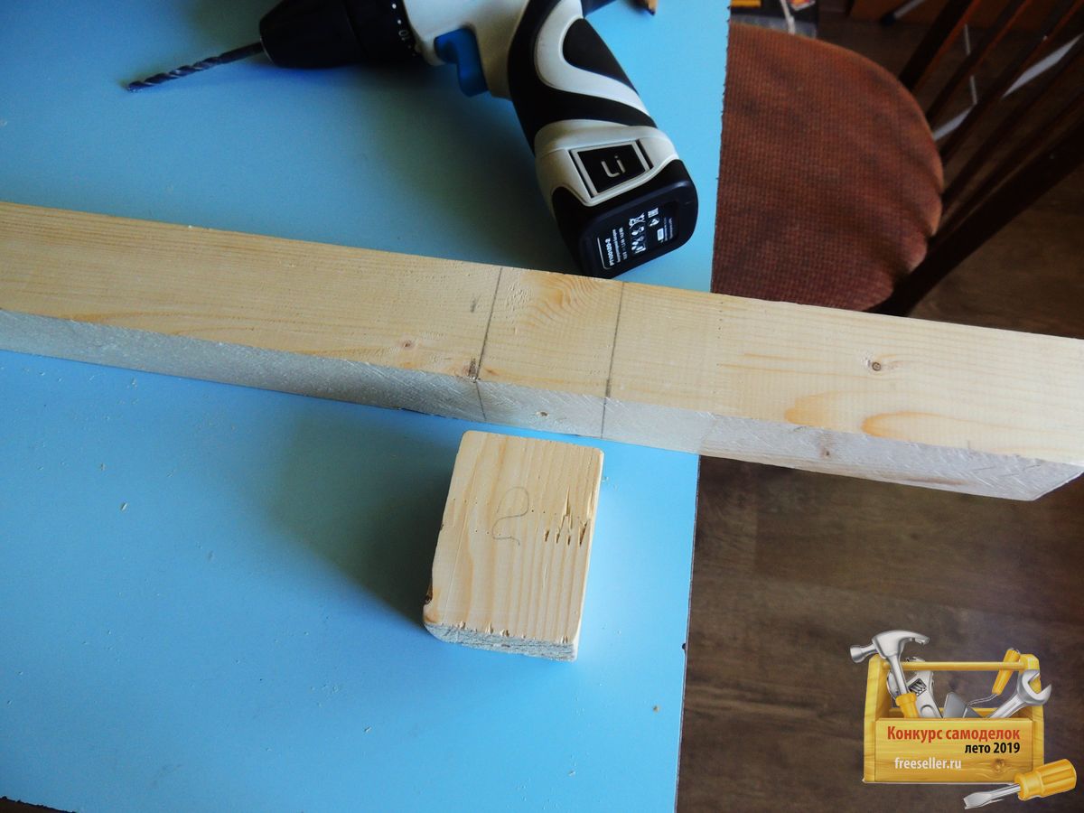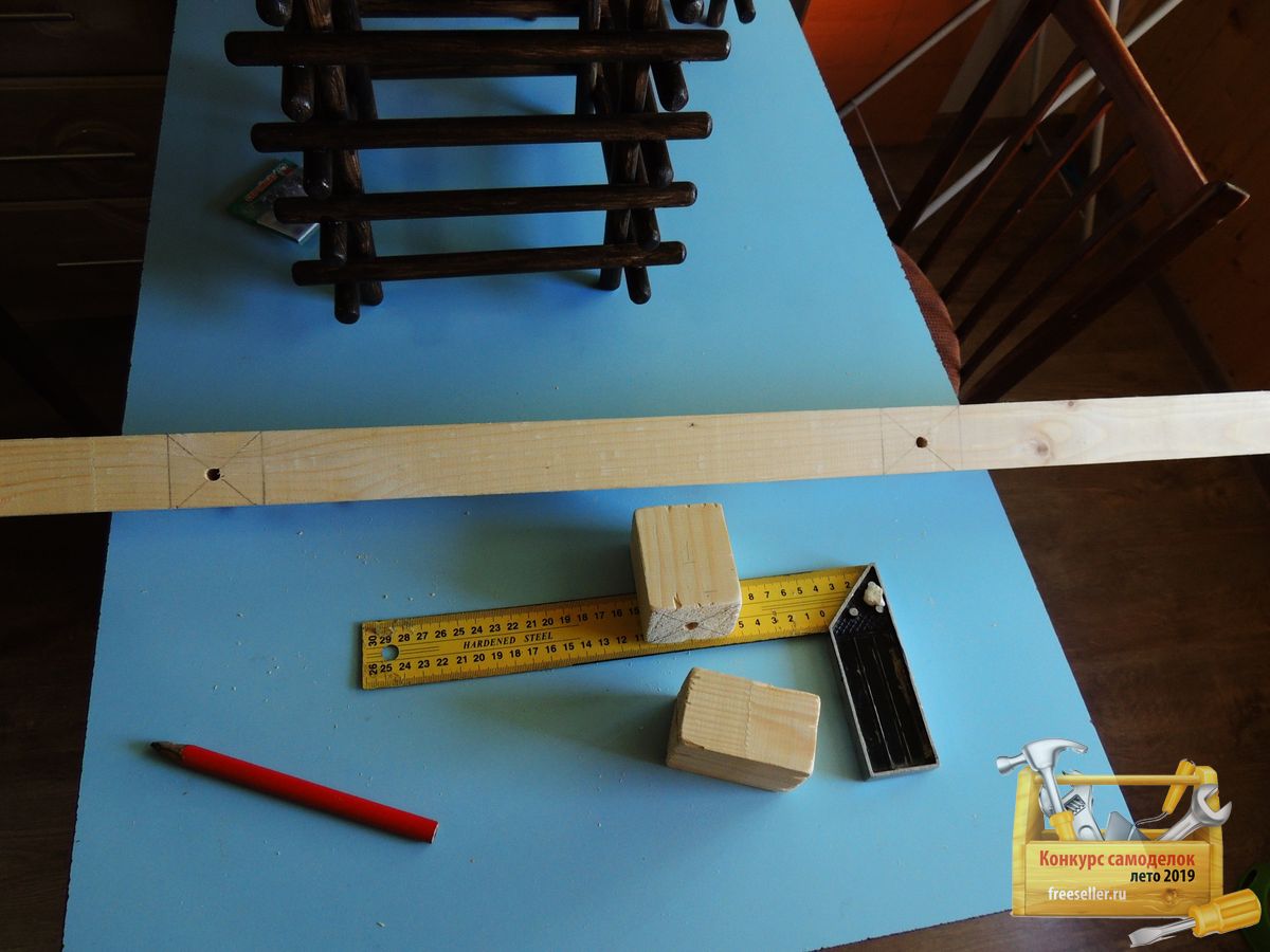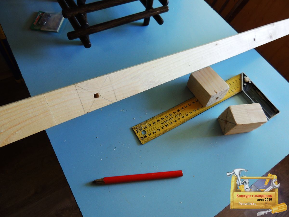 Затем, на коротких брусках, нанес разметку для того, чтобы по центру просверлить отверстие, по которому в дальнейшем будет проведен кабель.