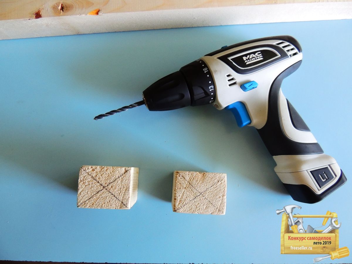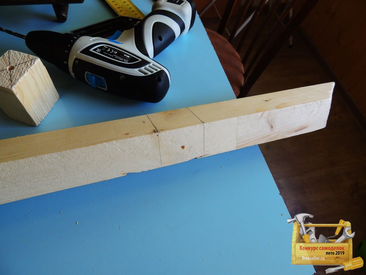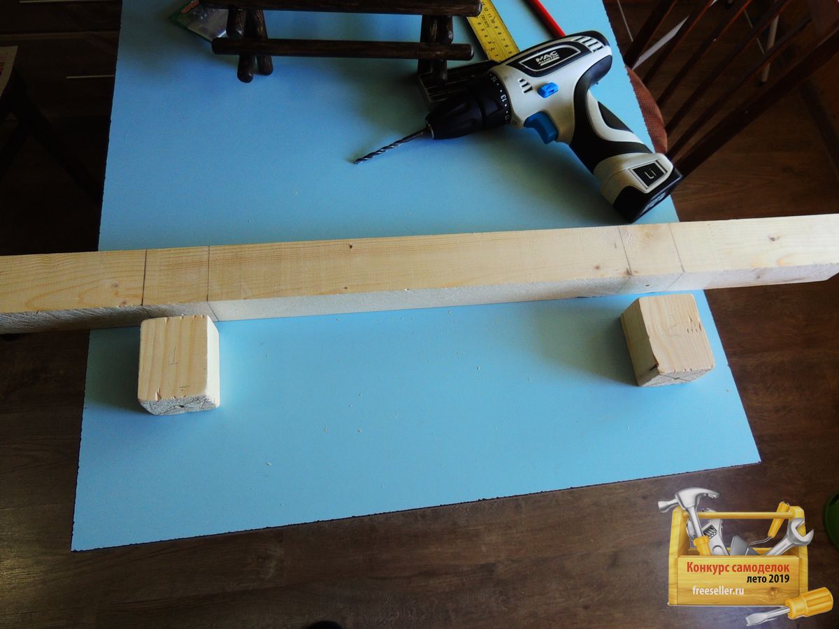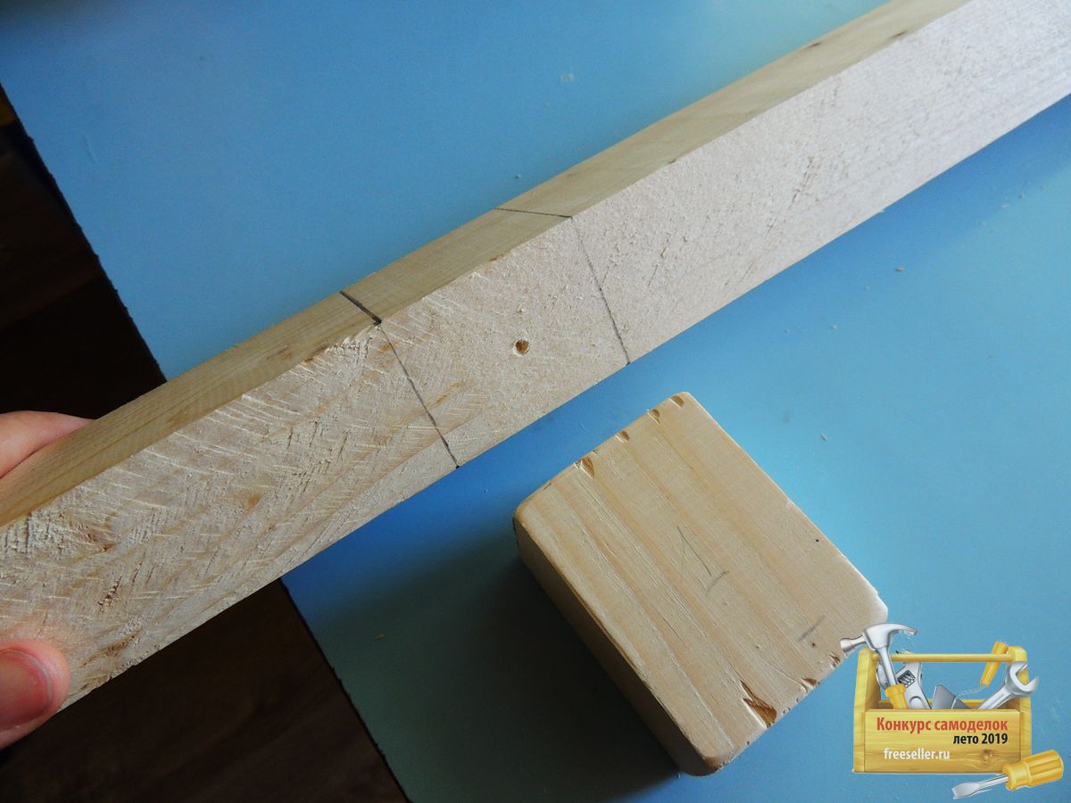 Затем, на коротких брусках, нанес разметку для того, чтобы по центру просверлить отверстие, по которому в дальнейшем будет проведен кабель.