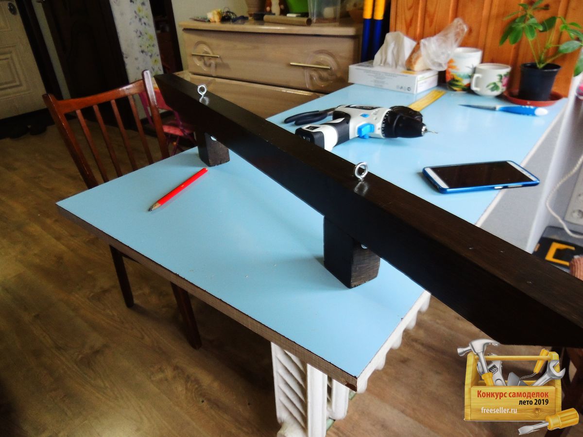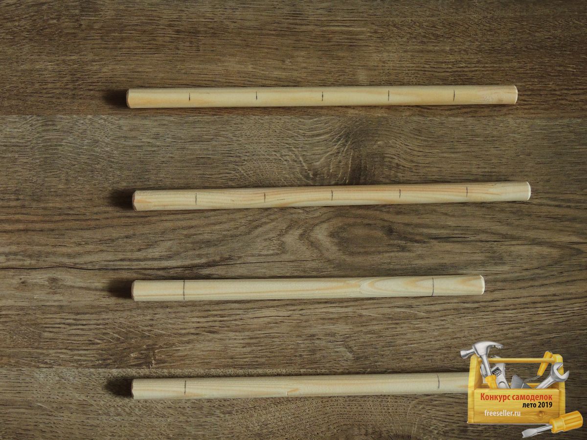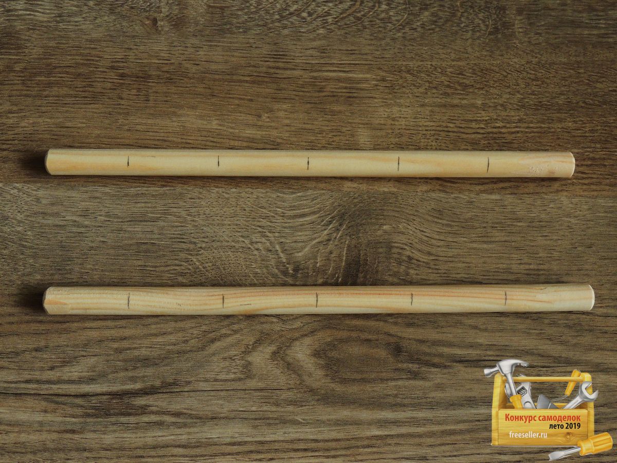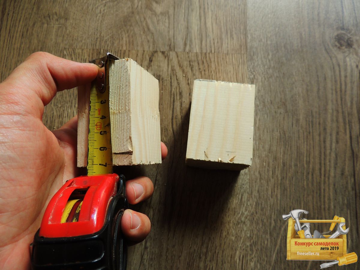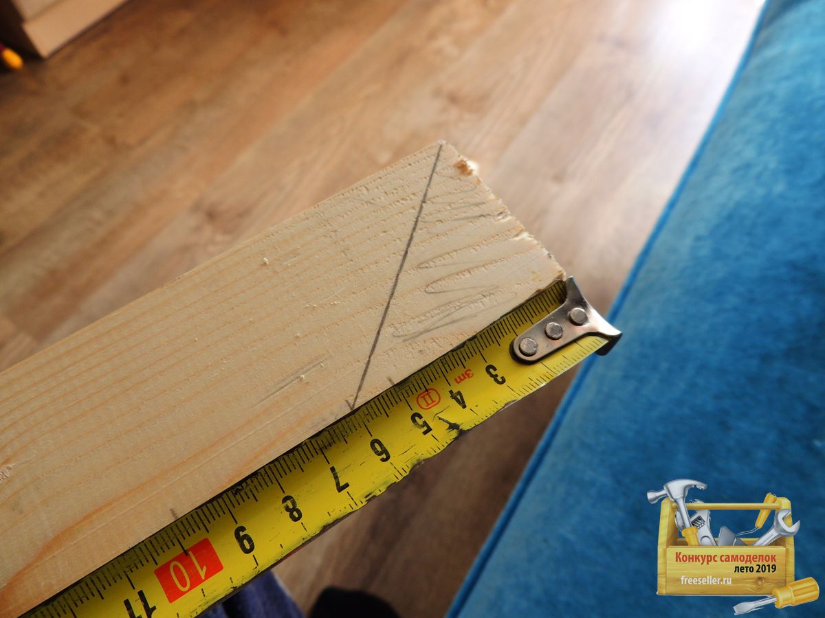Затем, на коротких брусках, нанес разметку для того, чтобы по центру просверлить отверстие, по которому в дальнейшем будет проведен кабель.