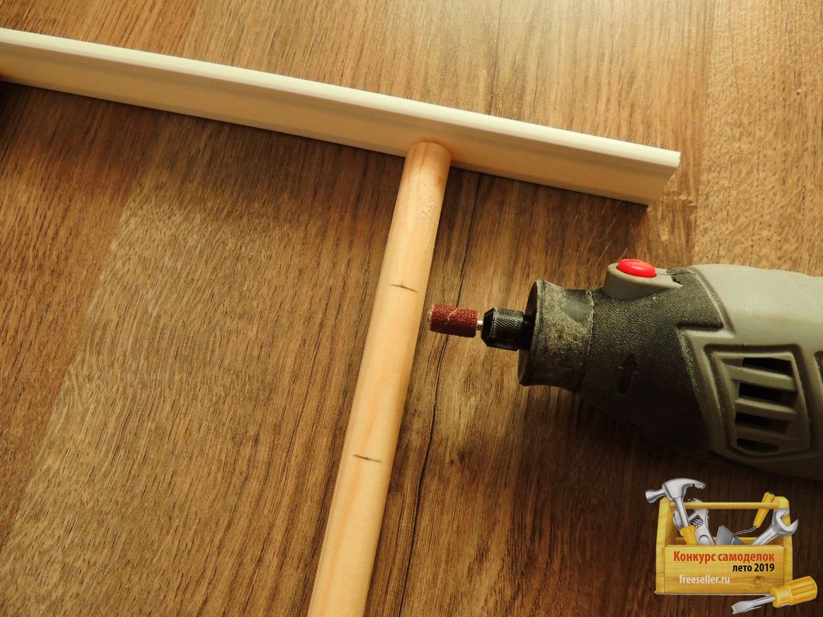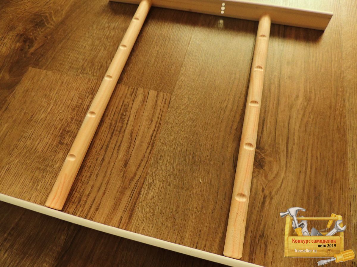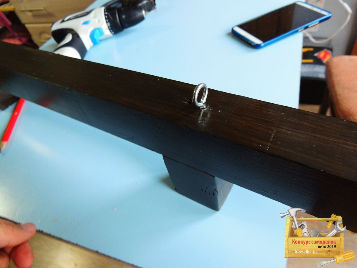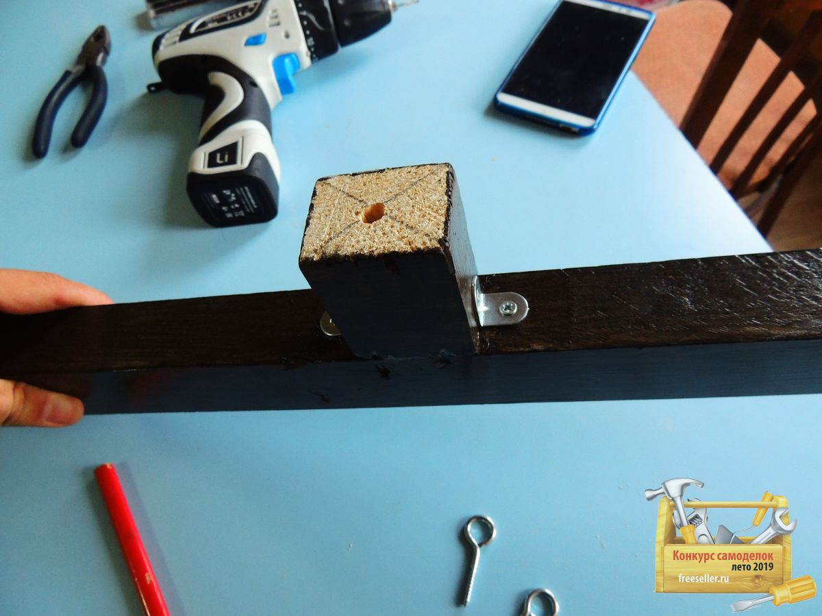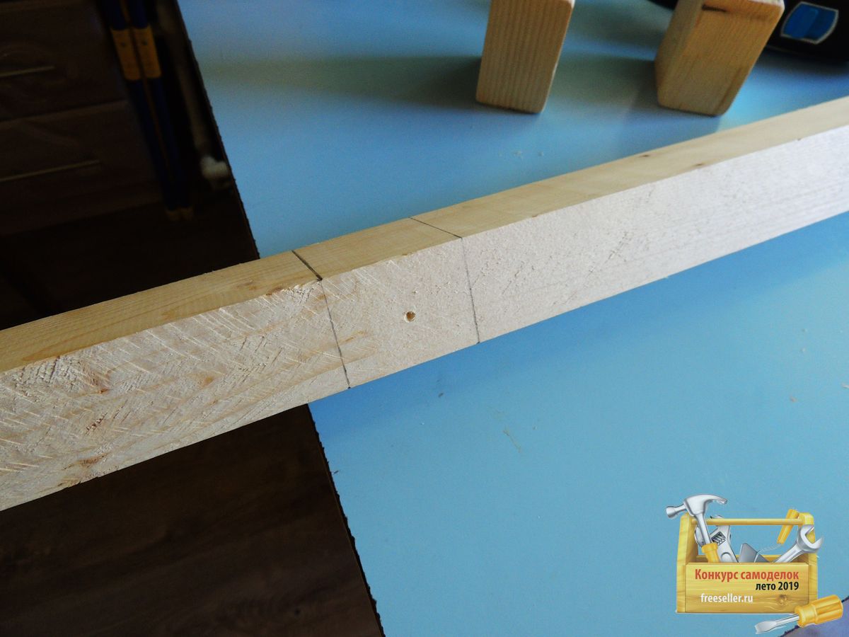 Далее через отверстие сделал метку на длинном брусе и просверлил отверстие.