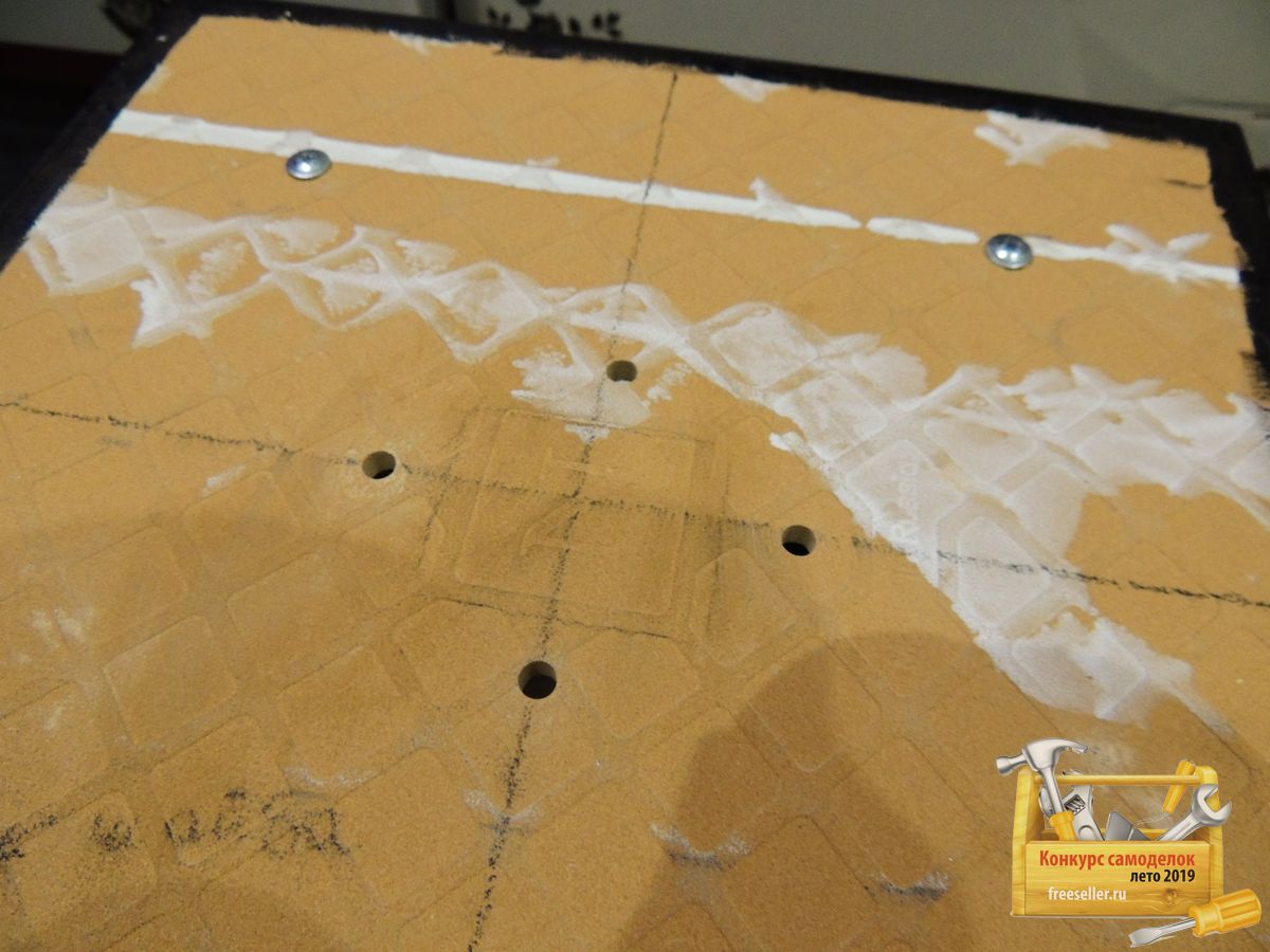 Затем приложил плитку и сделал метки на вертикальных рейках, просверлил тонким сверлом отверстия под саморез.