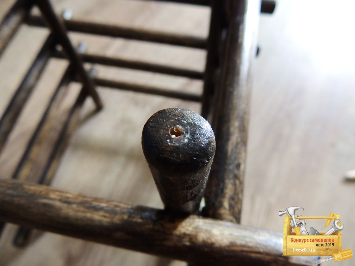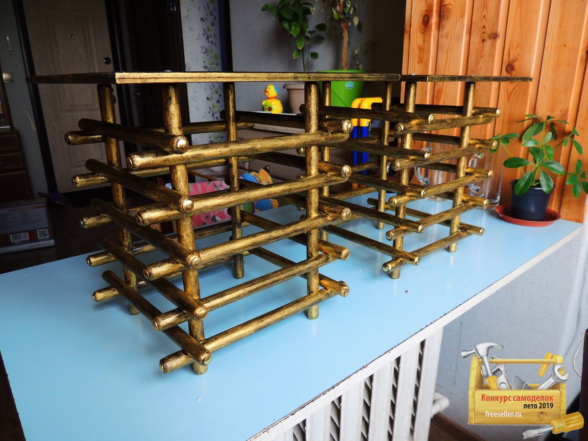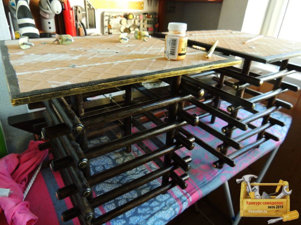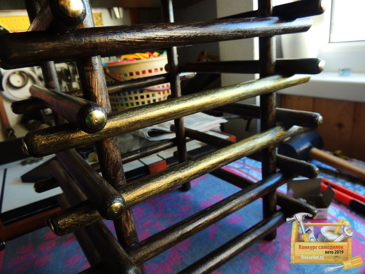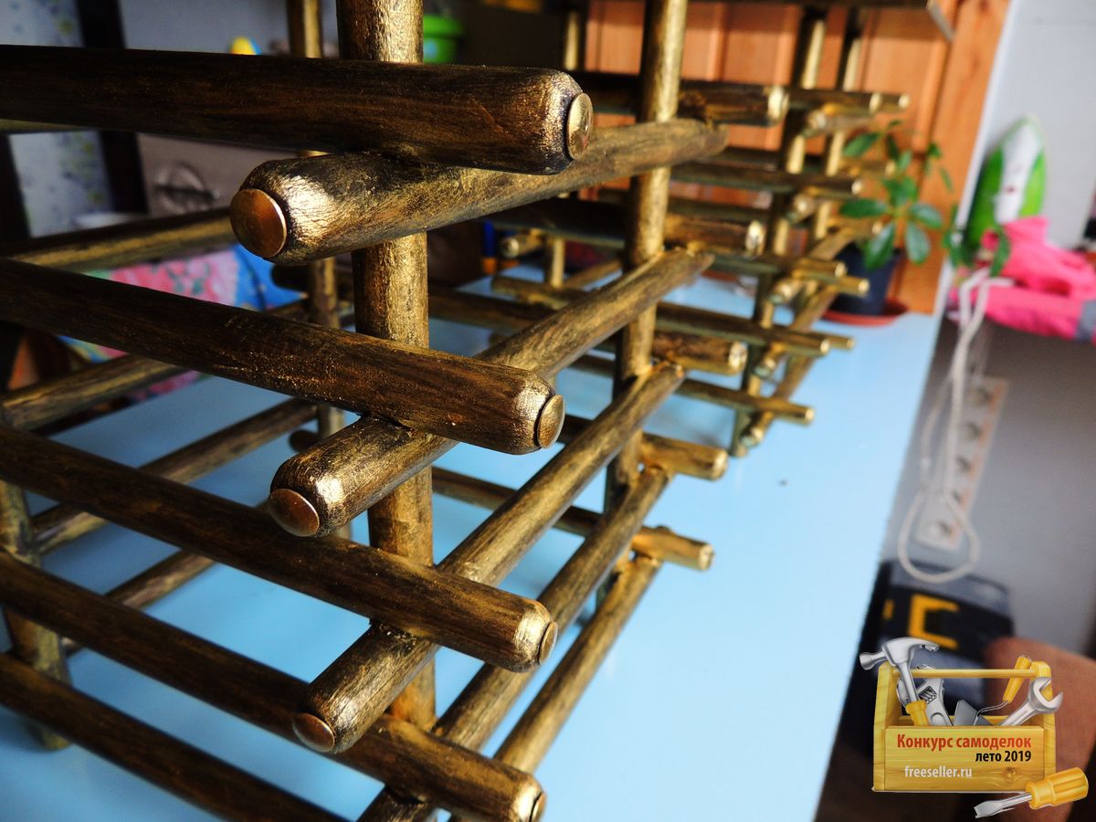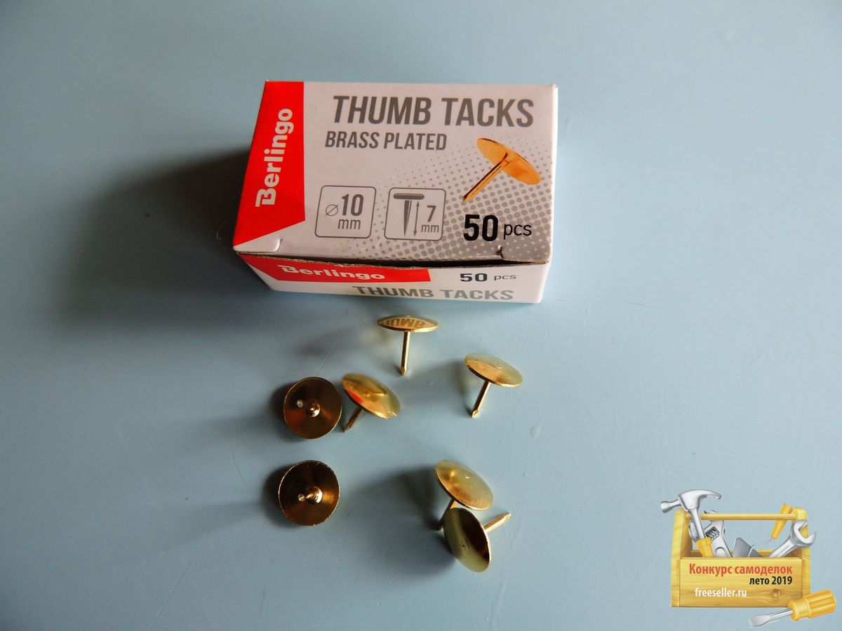 Теперь перешел к декору каркаса. Захотел украсить края реек, так как они смотрелись не очень приглядно, для этого взял обычные канцелярские кнопки золотого цвета.
