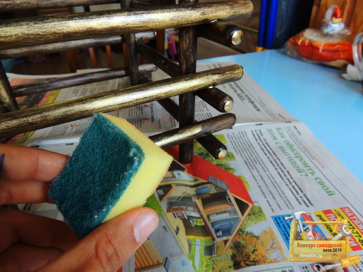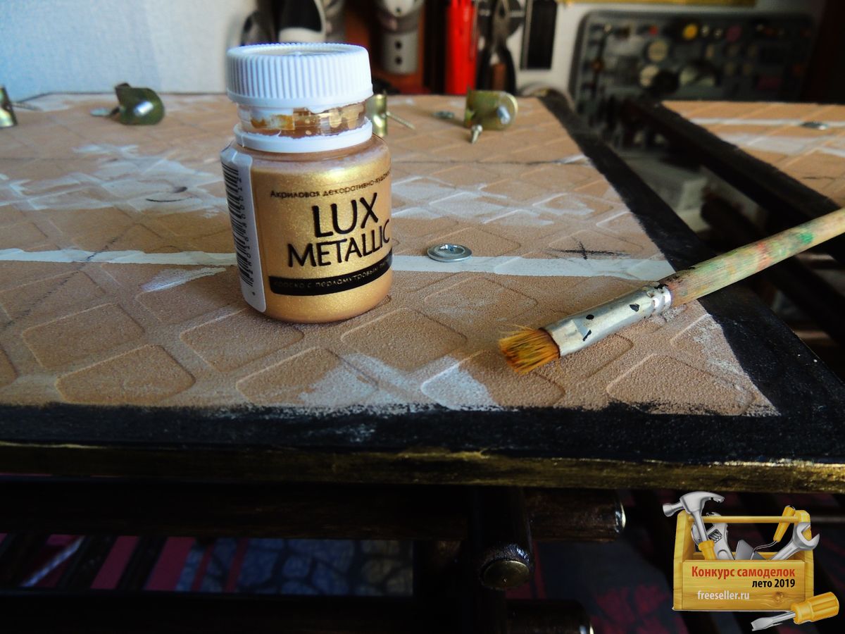 Далее купил акриловую краску золотого цвета и принялся красить каркас и край плитки, при помощи небольшой губки равномерно растирал по поверхности.