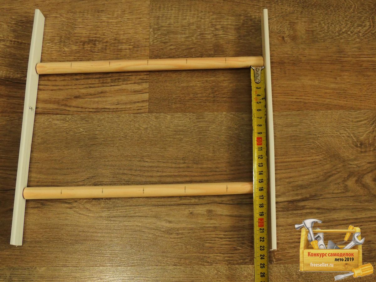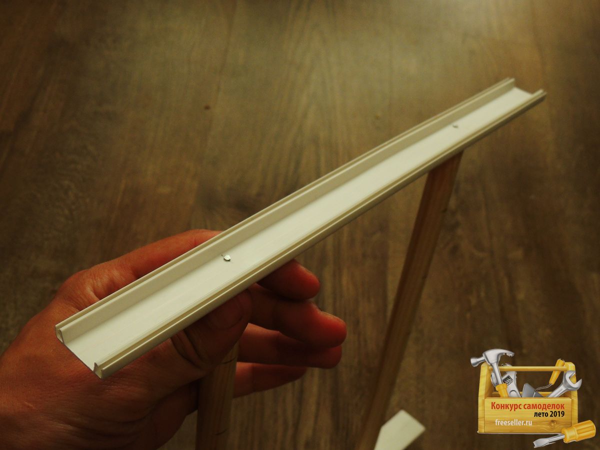 Для того чтобы точно закрепить рейки между собой сделал небольшой шаблон из короба от проводки, ширина между рейками выставил 15 см.