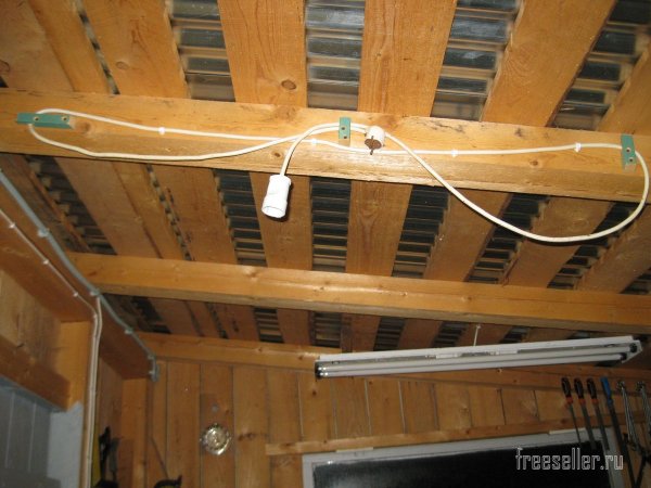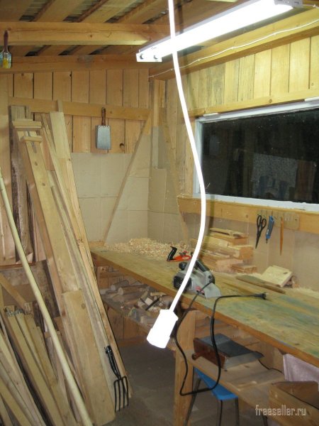 Правда в этом случае понадобится установить рядом с началом верстака высокий шест с перекладиной (высотой от 2,5 до 4 метров) и на него подвешивать удлинитель. Причем для быстрой установки или уборки такого шеста, можно, например, забить в землю отрезок железной трубы и выткать шест в нее.