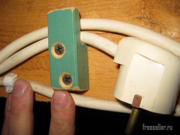 А два конца этого удлинителя с розеткой и вилкой, получились свободными. Когда удлинитель не нужен, я просто закладываю их вот за такую деревянную скобку. В таком положении удлинитель совершенно не мешает.