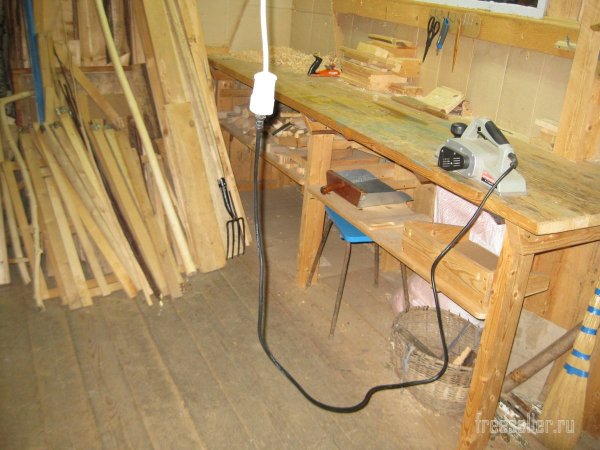 А второй конец удлинителя (длиной около метра), повисает на расстоянии примерно 60-70 см, от верстака, сбоку у самого его начала.