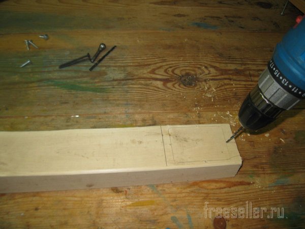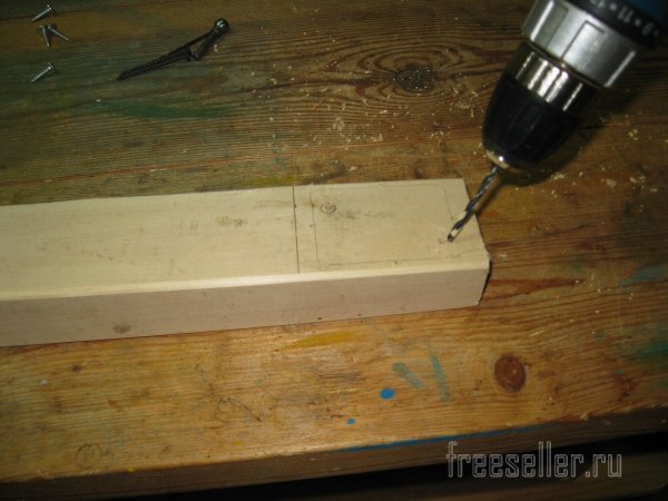 После разметки бруска, сверлим в нем четыре глухих отверстия, диаметром 2,5 мм, под шурупы с прессшайбой и два сквозных отверстия диаметром 4 мм, для его крепления к стене.