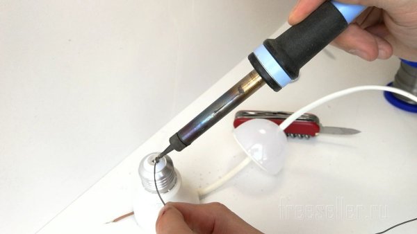 Припаиваю провода. Один провод нужно просунуть в просверленное отверстие в цоколе. Второй провод к боковому контакту.![]()