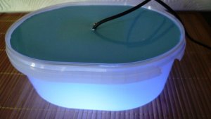 Сама платка установлена на крышке пластмассовой коробки. Сверху наклеил светонепроницаемую пленку. Помещаем в коробку например –телефон, наушники в общем любые небольшие предметы, закрываем крышкой и включаем питание. Время стерилизации – до 30 минут.