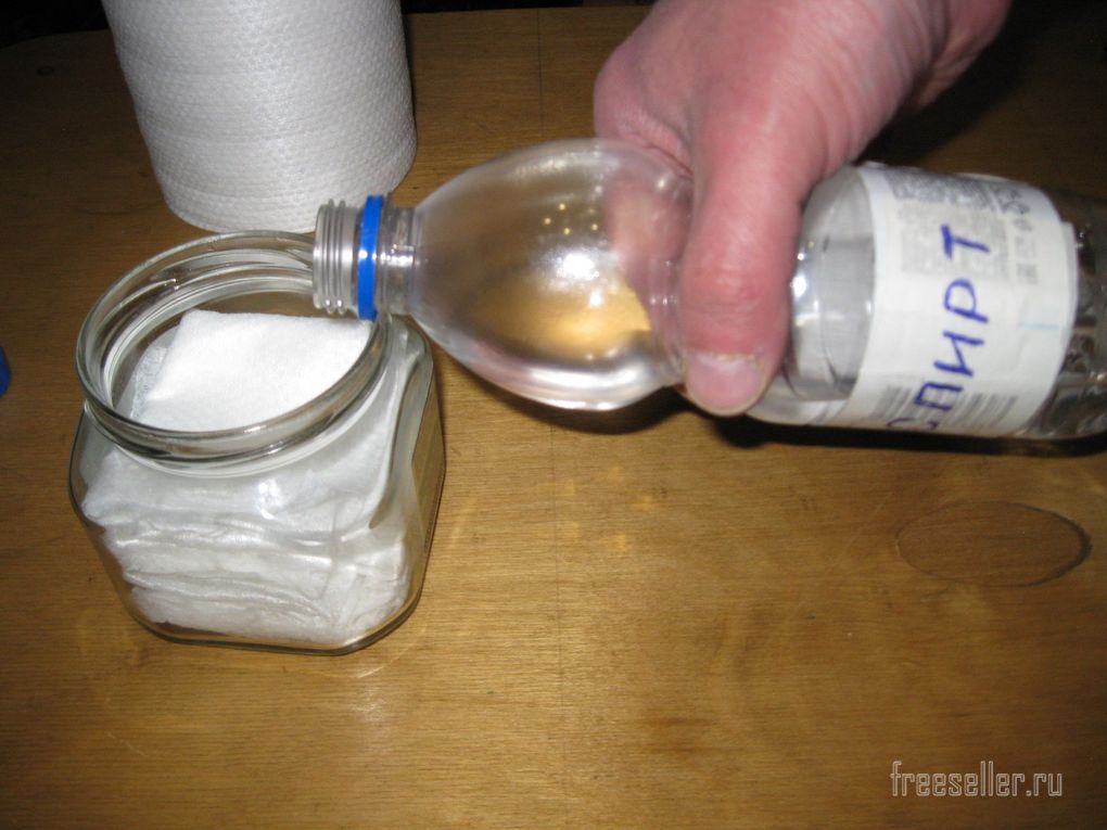 Теперь осталось только залить в эту банку спирт. Я использую для этого медицинский спирт. Как правило, его достаточно грамм 100, чтобы все салфетки тщательно пропитались.