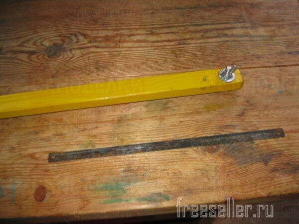 Поэтому для срезки камышей, я сделал себе очень простое приспособление из самодельной штанги и полотна от ножовки по металлу.