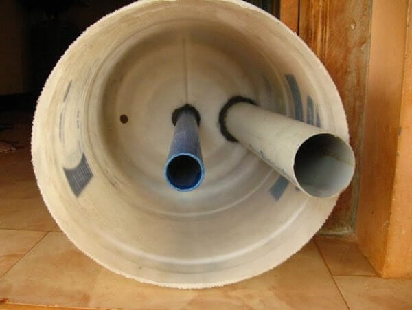 Следующее фото показывает, размещение труб внутри газгольдера, направляющую трубу диаметром 32 мм (в центре) и подающую трубу диаметром 64 мм, закрепленную при помощи самоклеющегося уплотнителя. Маленькое отверстие слева предназначено для подключения системы подачи газа.